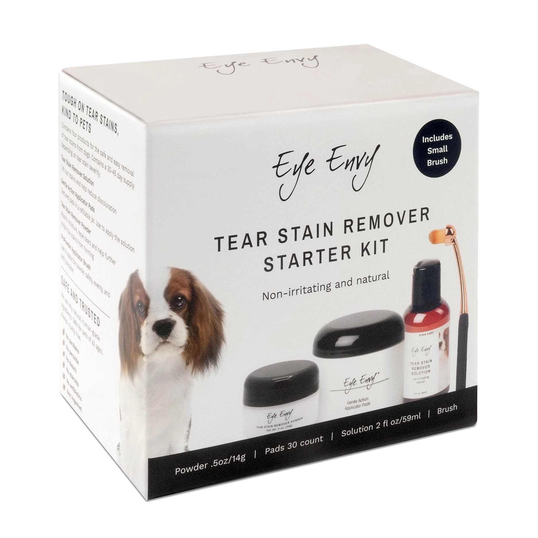 Eye Envy -puuteri sisältää miedon puhdistusaineen ja antibakteerisen aineen, joka estää bakteerien kasvua ja auttaa poistamaan kyyneltahroja. Puuteri imee kosteutta ja auttaa hylkimään uusia kyyneleita. Eye Envy Tear Stain Remover Powder EI ole liitu tai peiteaine vaan luonnollinen silkkimäinen puuteri, joka pitää lemmikkisi silmänympärykset turvallisesti kuivana, tahrattomana sekä kirkkaina.